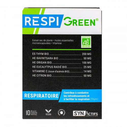 Les gélules RespiGreen respiratoire SynActifs constituent un complément alimentaire recommandé à l’approche de l’hiver pour lutter contre les refroidissements et libérer les voies respiratoires en cas de rhume. Elles sont formulées à base d’extrait sec de thym bio qui lutte contre l’inflammation des voies respiratoires supérieures et calme la toux, d’acérola riche en vitamine C qui renforce le système immunitaire, d’huile essentielle d’origan bio aux propriétés antibactériennes et antivirales, d’huile essentielle de ravintsara bio aux propriétés antivirales et anti-infectieuses, d’huile essentielle de ciron bio qui aide à prévenir les infections hivernales et d’huile essentielle d’eucalyptus radié bio recommandé pour traiter les infections respiratoires telles que rhinites, rhino-pharyngites ou encore toux grasse.