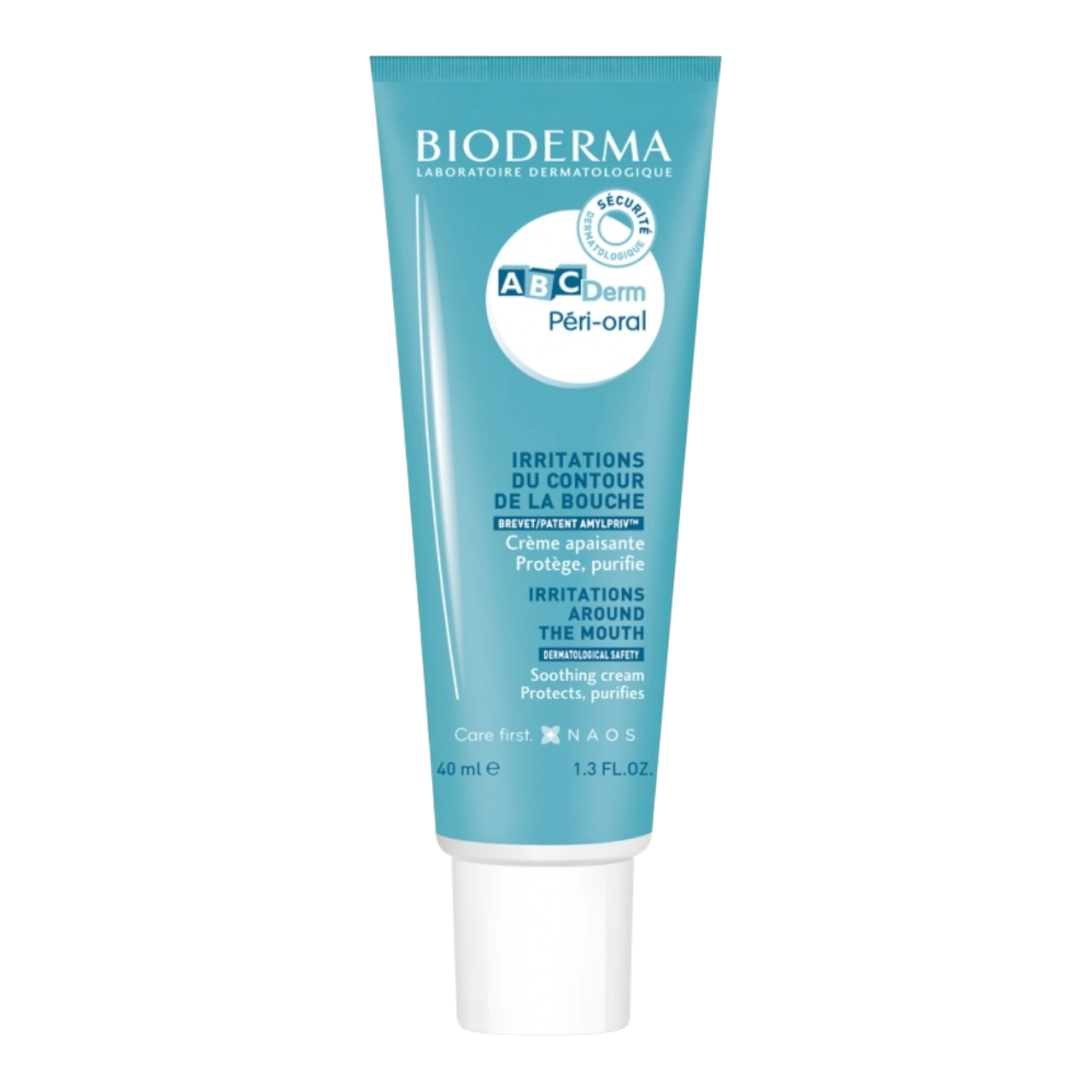 Soin Bioderma ABCDerm Péri-Oral 40ml. Calme, répare et protège les irritations du contour de la bouche (salive, sucette) du bébé. Brevet exclusif Amylpriv™.