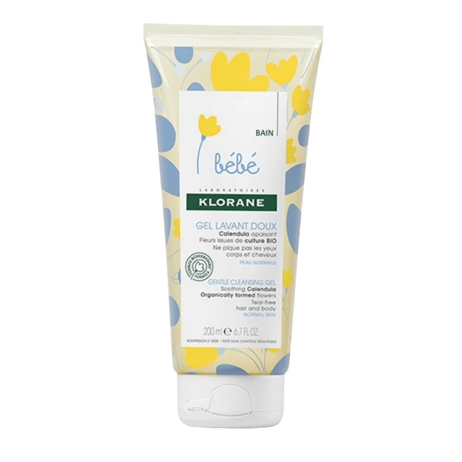 Gel lavant doux Klorane Bébé au calendula BIO. Nettoie corps et cheveux de bébé en douceur. Formule 2-en-1 hypoallergénique, testée sous contrôle pédiatrique.